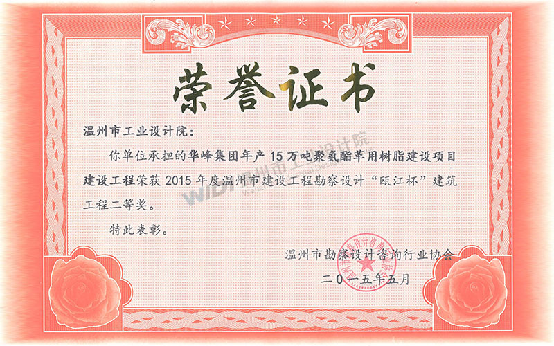 華峰集團(tuán)年產(chǎn)15萬噸聚氨酯革用樹脂建設(shè)項(xiàng)目建設(shè)工程 錢江杯表揚(yáng)獎